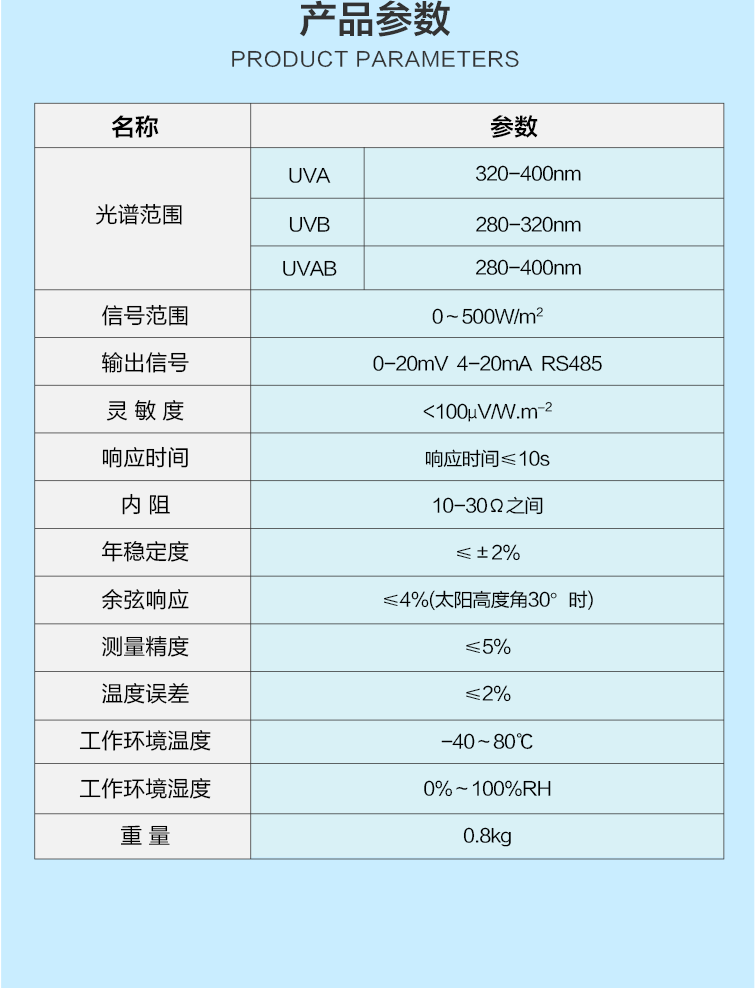 TBQ-UV系列紫外輻射傳感器用于測(cè)量和記錄環(huán)境中280-400nm的紫外輻射強(qiáng)度的一款高性能的環(huán)境監(jiān)測(cè)設(shè)備。產(chǎn)品特點(diǎn)在于其高精度、快速響應(yīng)和穩(wěn)定性強(qiáng),能夠準(zhǔn)確捕捉并反映紫外輻射的變化情況。無(wú)論是在氣象觀測(cè)、環(huán)境監(jiān)測(cè)、皮膚健康研究還是戶外工作場(chǎng)所的安全評(píng)估中,紫外輻射表都發(fā)揮著至關(guān)重要的作用。